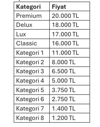 - Birinci Kategori: 6000 TL