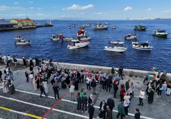 İzmir’de, Türk ve Filistin bayraklarıyla süslenmiş tekneler, Filistin’e ve Gazze’ye insani yardım ulaştırmak için yola çıkan ve İsrail’in saldırısına uğrayan Küresel Sumud Filosu’na destek verdi. Filistin’e Destek Platformu tarafından organize edilen etkinlik çerçevesinde, İzmir Sivil Toplum Kuruluşları Platformu üyeleri de ellerinde Türk ve Filistin bayraklarıyla tekneleri karşıladılar.